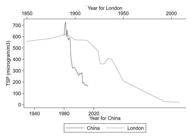 注释:上图显示了两国的年平均总悬浮颗粒 (TSP)——一种粗略的、现已不再使用的空气污染测量方法。黑线代表中国的平均值,灰线代表伦敦。